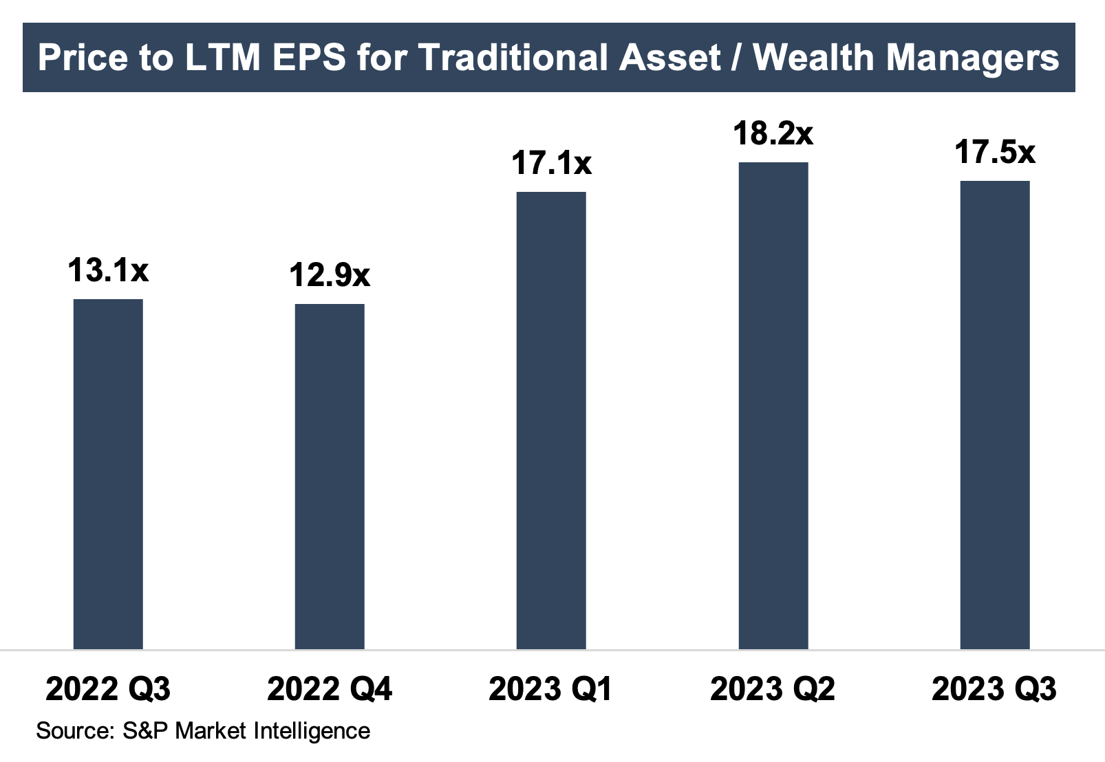 The median LTM earnings multiple for publicly traded asset and wealth management firms decreased 3.8% during the third quarter of 2023, representing the first decrease since Q4 2022. After trending downwards for most of 2022, multiples began to increase during the first half of 2023 as LTM earnings metrics began to fully reflect the impact of 2022 market conditions. The modest multiple decrease in Q3 2023 also reflects the moderating interest rate environment and market decrease during the quarter, translating into slightly lower AUM balances and future earnings power for RIAs.