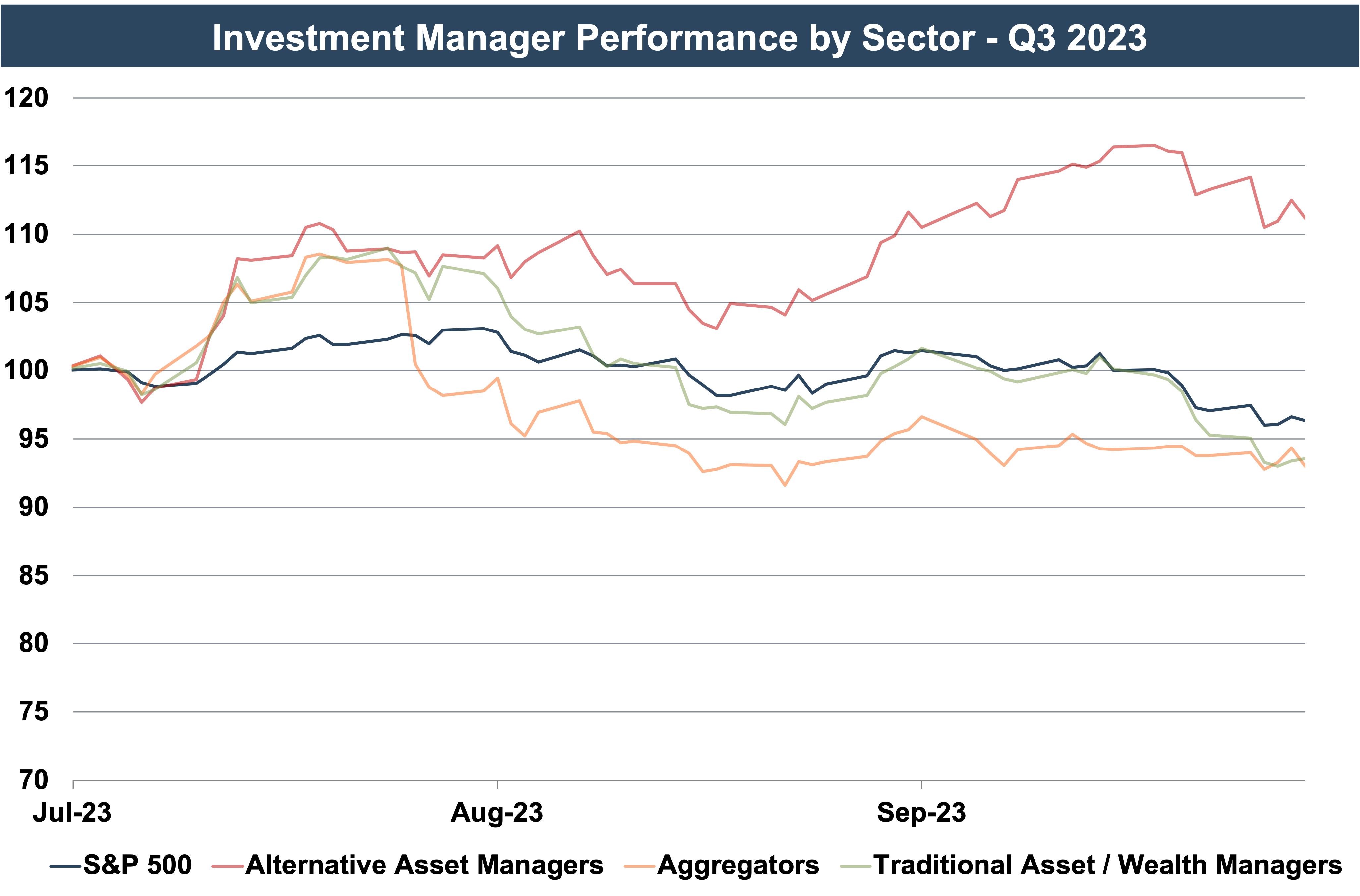 Share prices for most publicly traded asset and wealth management firms trended in line with the steady decrease in the broader market during Q3 2023. Alternative asset managers were a notable exception to this trend, ending the quarter up about 10%. On a year-over-year basis, all categories of RIAs experienced exceptional growth as the markets rebounded from their Q3 2022 trough, which marked the deepest dip since March 2020. RIAs directly benefit from improving market conditions as they result in a stronger asset base on which to collect fees.