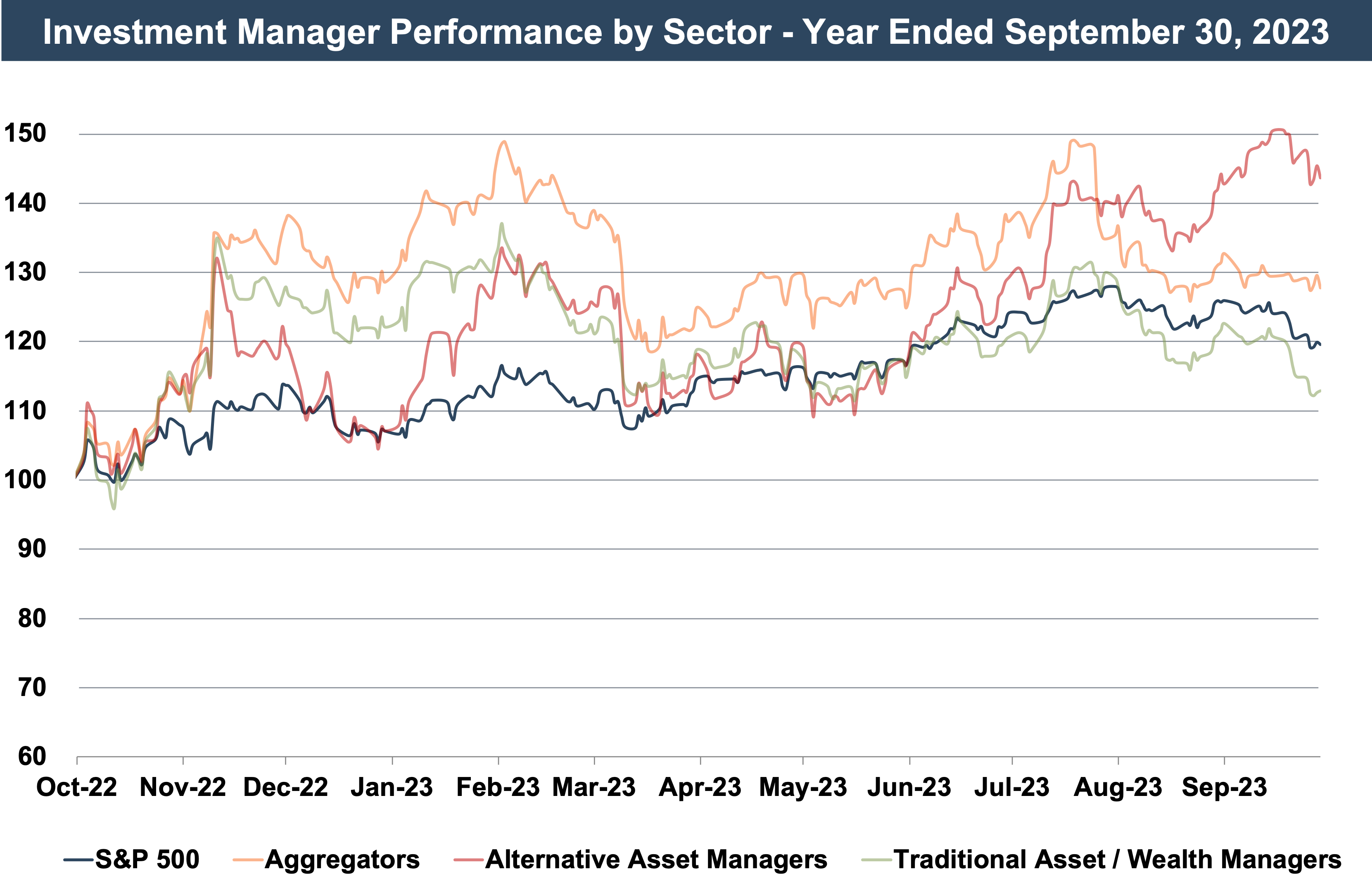 The market decline in Q3 translated to decreased prices for most public RIAs. Prices for aggregators and traditional asset managers faced a slightly more severe decline than the S&P 500. On the other hand, alternative asset managers experienced an increase in share price of just over 10%. In the last twelve months, most RIA sectors saw a decline in year-over-year earnings and revenue, reflecting the lower average AUM. Market volatility since 2020, which drove volatility in AUM during this period, is one of the factors responsible for the increased demand for alternative asset manager stocks. Private equity funds and other alternative investment vehicles typically lock in assets for ten to twelve years, leading to a more predictable and stable revenue stream that is less correlated with the broader market.