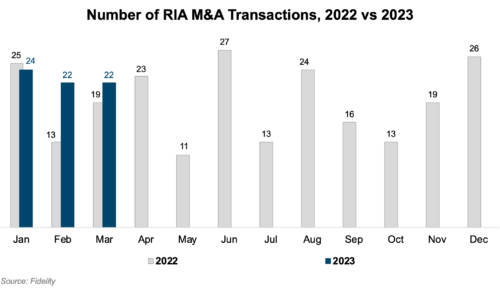 RIA M&A activity has remained resilient through the first quarter of 2023, even as macro headwinds have emerged for the industry over the past year. Fidelity’s March 2023 Wealth Management M&A Transaction Report listed 68 deals through March 2023, up 19% from the 57 deals executed during the same period in 2022. These transactions represented $108.3 billion in AUM—a 21% increase from the first quarter of 2022, although much of this increase was attributable to First Citizens Bank’s purchase of Silicon Valley Bank’s $15.9 billion RIA division in March. Excluding the SVB transaction, transacted AUM was up about 4% year-over-year.