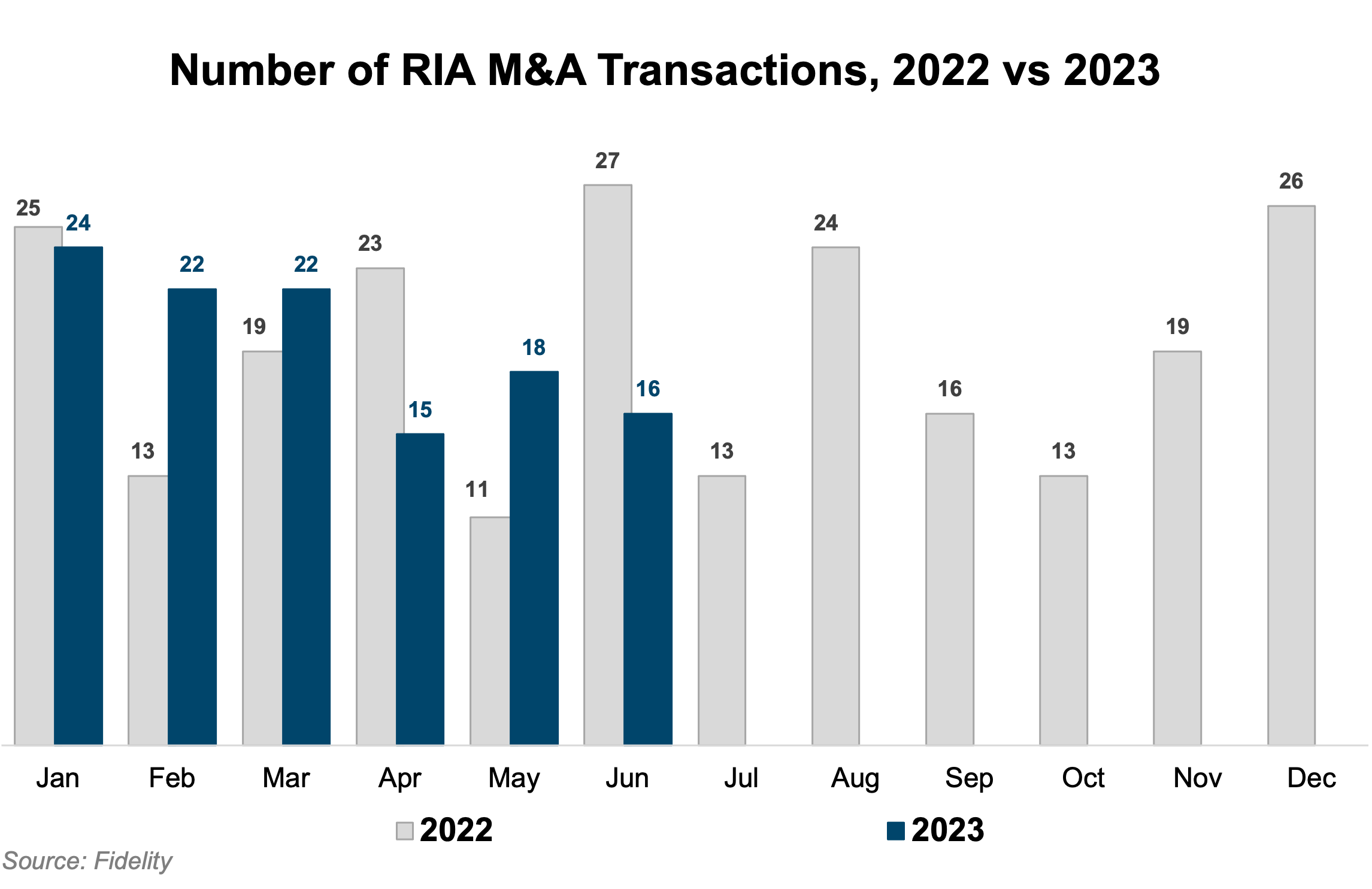 Although inflation has begun to subside and the stock market has rallied after a turbulent start to 2023, elevated interest rates and macroeconomic uncertainty have contributed to a slight decline in deal volume during the first half of 2023. Fidelity’s June 2023 Wealth Management M&A Transaction Report listed 117 deals through June 2023, down 1% from the 118 deals executed during the same period in 2022. Despite the slight decline in deal volume, total transacted AUM was $176.4 billion—a 10% increase from the same period in 2022.