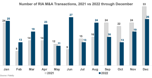 The fourth quarter decline in M&A activity could be viewed as a delayed reaction to market conditions that emerged early in 2022. Inflation, rising interest rates, and a tight labor market have strained the supply and demand dynamics that have driven deal activity in recent years. Rising costs and interest rates coupled with a declining fee base have put pressure on highly leveraged consolidator models. A potential downturn in performance has left some sellers on the sidelines until fundamentals improve. Despite these pressures, demand for RIAs remained strong throughout 2022, with professionalization of the buyer market continuing to be a theme driving M&A activity.