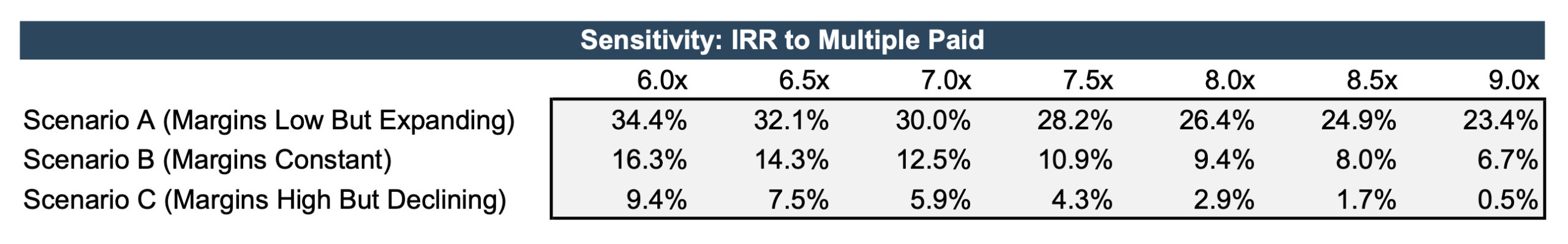 The sensitivity table below shows the buyer’s IRR in each scenario as a function of the multiple paid.1 For a given multiple, the IRR is highest in Scenario A (margins low but expanding) and lowest in Scenario C (margins high but declining). In Scenario A, the buyer can afford to pay a higher multiple and still generate an attractive rate of return (a 9.0x multiple results in an IRR of 23.4%). In Scenarios B and C, however, the buyer must pay a lower multiple in order to generate the same IRR, even though the initial margin is higher.