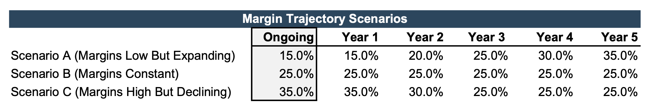 A high margin conveys that a firm is doing something right. But what really matters from a buyer’s perspective is not what the margin is now, but what it will be in the future. Consider the three scenarios below. In Scenario A, the EBITDA margin starts relatively low (15%), but improves over time. In Scenario B, the margin starts at a higher level (25%) but remains constant. In Scenario C, the margin starts at 35% but declines over time.