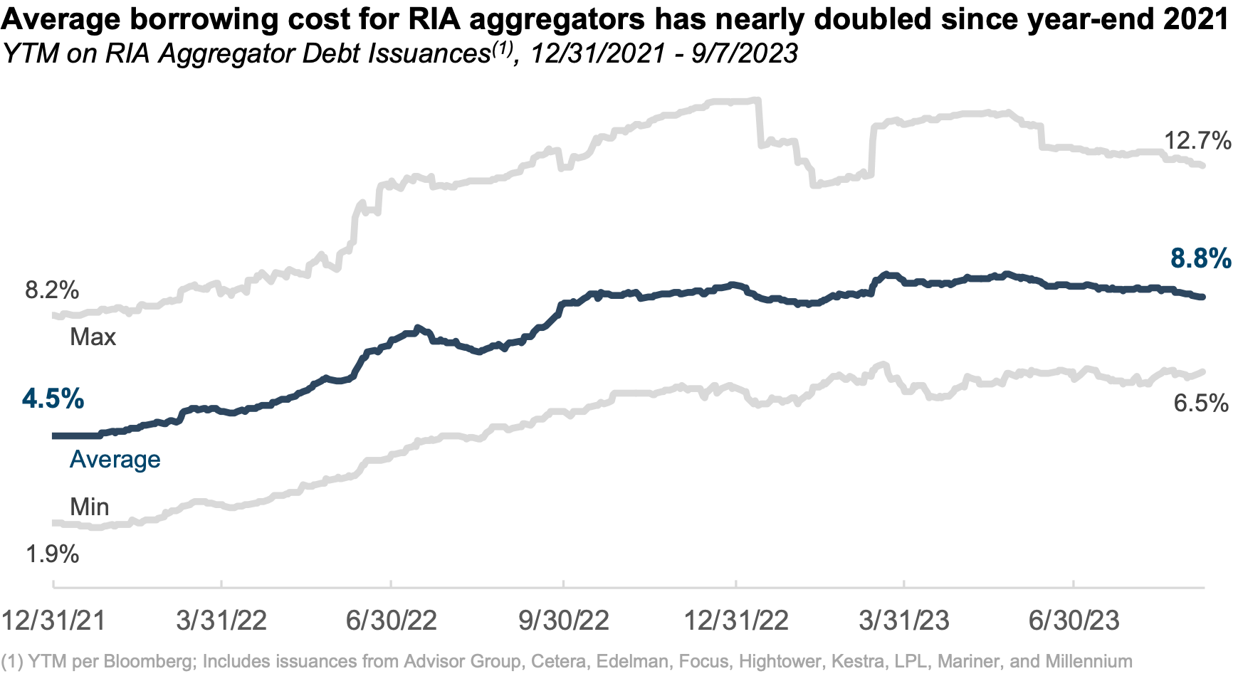 We first wrote about borrowing costs for RIA consolidators late last year, shortly after the Fed’s aggressive hiking cycle led to an abrupt spike in interest rates for virtually all borrowers. Since then, borrowing costs for RIA acquirers have remained roughly flat but at a level significantly elevated from 18 months ago: