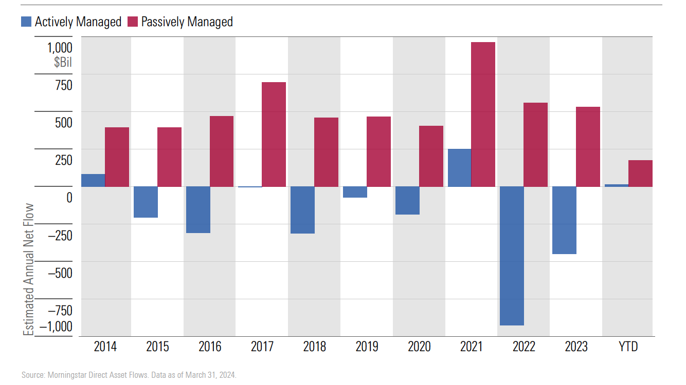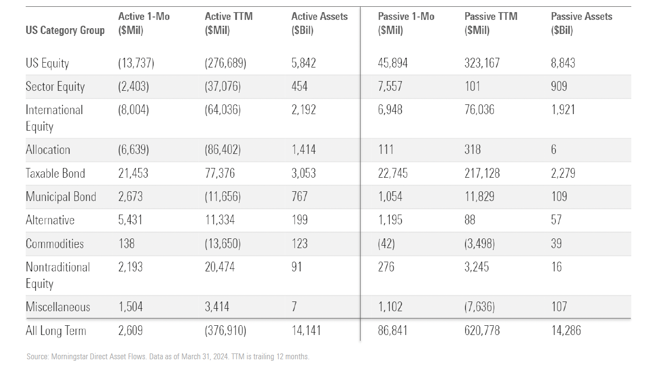 On the other hand, passively managed funds continued to outpace active funds in terms of net new assets over the past twelve months.  The Morningstar data shows that total inflows across passively managed funds for the year ended March 31, 2024, were approximately $621 billion, with all asset classes except commodities and miscellaneous assets reporting positive net inflows.