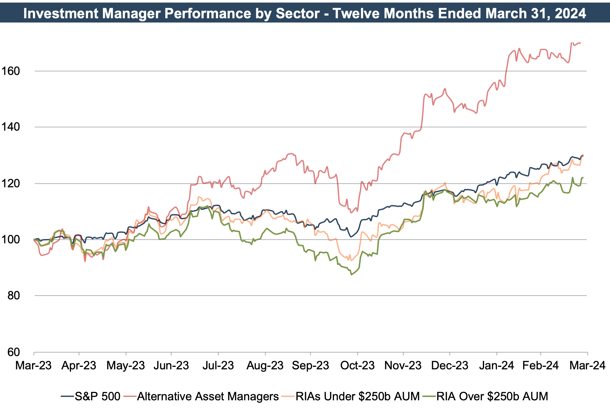 Despite persistent inflation, elevated interest rates, and heightened geopolitical tensions, the asset management industry and the stock market as a whole saw a resurgence during 2023.  Our index of publicly traded asset management firms generally tracked the movement in the broader market, with stock prices for smaller asset managers (AUM under $250 billion) up 30.3% and large asset managers (AUM over $250 billion) up 22.0% over the year ended March 31, 2024, while the broader market (S&P 500) was up 29.9%.