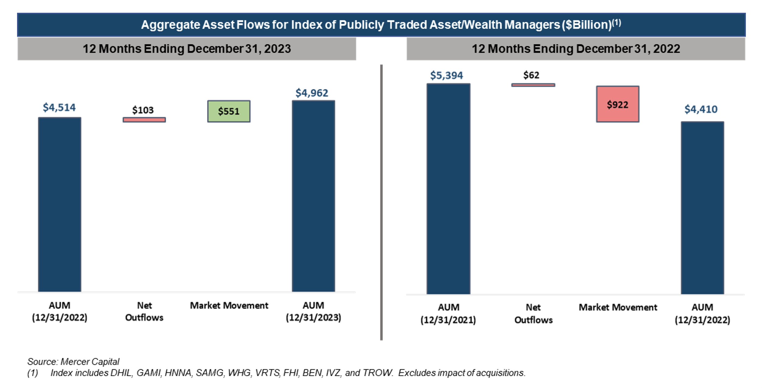 Many asset managers have struggled with organic growth in recent years, partly due to rising fee sensitivity and the influence of passively managed investment products.  This year proved no different, with our index of publicly traded asset/wealth management companies seeing $103 billion in aggregate net outflows, compared to aggregate net outflows of $62 billion in 2022.