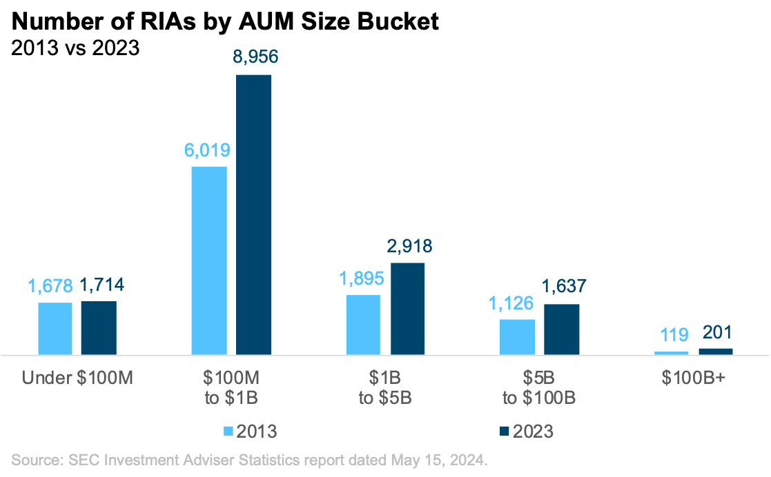 By this metric, there has been some degree of consolidation: the largest firms (those over $100B) have increased their share of industry assets from 53% in 2013 to 66% in 2023. Most of the market share gained by the largest firms has come from those in the $5B to $100B AUM range, while firms below $5B have seen more stable market share. This makes some sense: most new RIAs formed over this period have been below $5B; thus, the rising number of RIAs has been a more significant offset to consolidation in this market segment.
