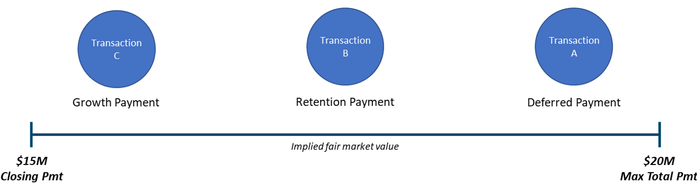 The figure below illustrates directionally how the transactions compare in terms of the fair market value they imply.  The most certain transaction structure (Transaction A) implies a fair market value closest to the top end of the range ($20 million) but still below due to the time value of money and buyer credit risk.  The least certain structure (Transaction C) implies a fair market value closer to the bottom end of the range, given the relatively high risk of achieving the growth hurdle.  Transaction B is somewhere between the other two transactions in terms of risk and timing of the payment, and as such, the implied fair market value lies between the other two.