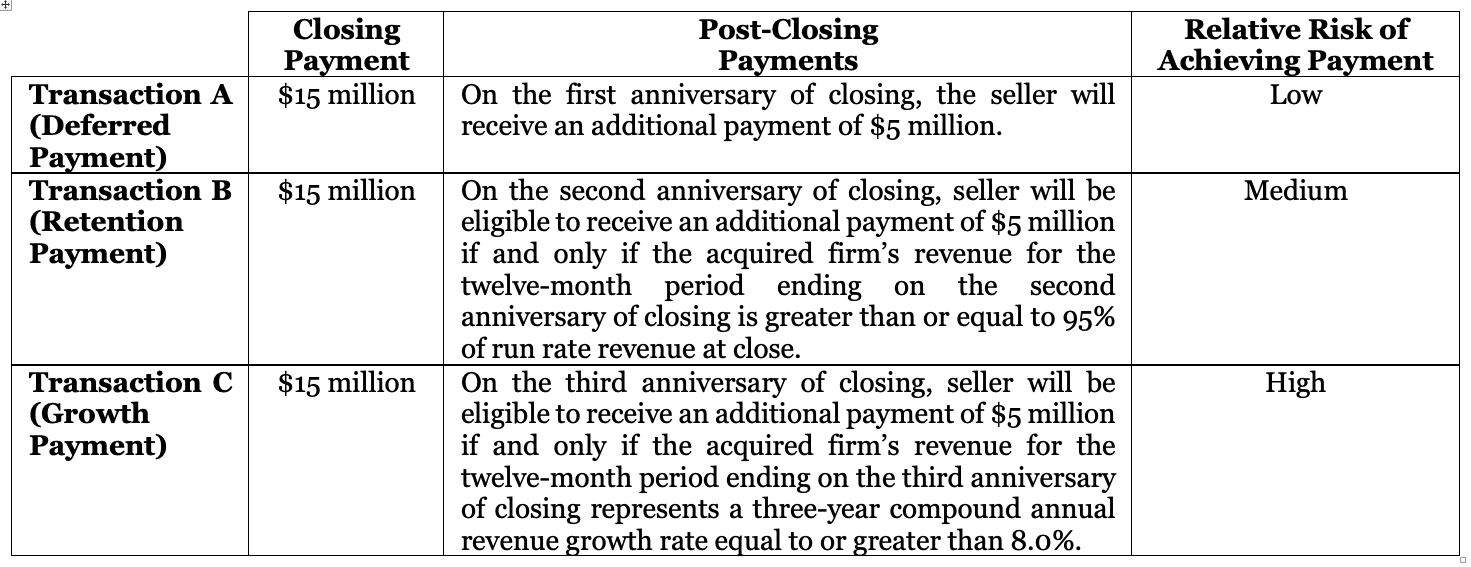 Each of the three transactions features a $15 million closing payment and potential additional consideration of $5 million, for a total possible consideration of $20 million.  In Transaction A, the additional payment is simply deferred for one year, whereas in Transaction B, it is contingent on revenue retention, and in Transaction C, it is contingent on revenue growth.  Transaction A offers the most certainty in terms of risk, with the additional payment contingent only on the buyer’s future creditworthiness.  In Transaction B, the seller must maintain at least 95% of existing revenue into the second year post-closing.  While this is a relatively low bar, assuming the firm can grow organically and benefits from the upward drift of markets, the payment is at risk if there is significant client attrition or a protracted bear market.  In Transaction C, the additional payment is contingent on the acquired firm achieving sufficient net organic growth and market growth over three years in order to generate an 8% revenue CAGR.