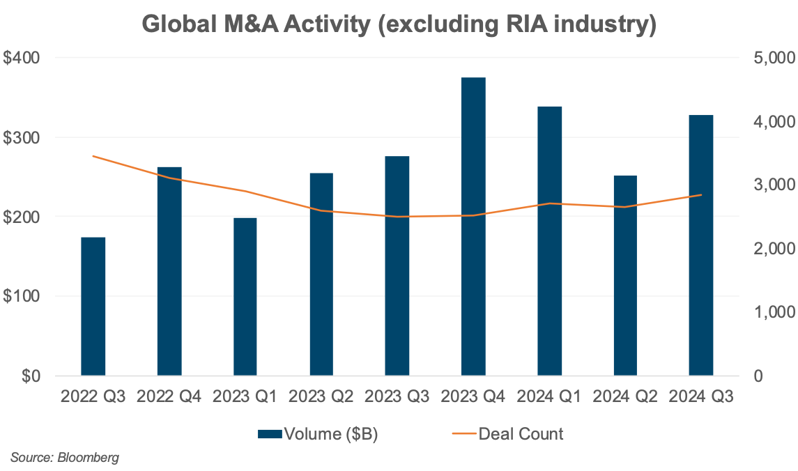 RIA deal activity experienced a greater decline than the broader M&A market. The number of M&A transactions for all industries (excluding the RIA industry) increased 3% year-over-year through the first three quarters of 2024 (per Bloomberg), compared to a decline of 11% in the RIA industry.