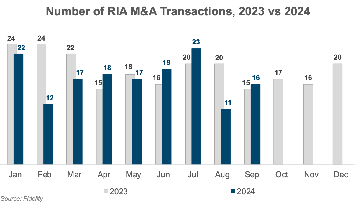 Following a year where deal volume in the RIA industry nearly matched the all-time high of 2022, RIA M&A activity has cooled in 2024. Fidelity’s September 2024 Wealth Management M&A Transaction Report listed 155 deals through September 2024, down 11% from the 174 deals executed during the same period in 2023.