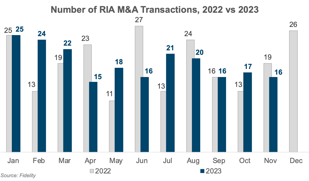RIA M&A activity has demonstrated remarkable resilience, defying initial expectations of a slowdown amid challenging macroeconomic conditions. As the economy entered 2023 facing high inflation, rising interest rates, and tight labor markets, many anticipated a decline in M&A activity. However, Fidelity’s November 2023 Wealth Management M&A Transaction Report listed 210 deals through November 2023, up 3% from the 203 deals executed during the same period in 2022. Notably, there was a significant uptick in total transacted AUM during 2023. Total transacted AUM through November 2023 was $336.6 billion—a 25% increase from the same period in 2022.