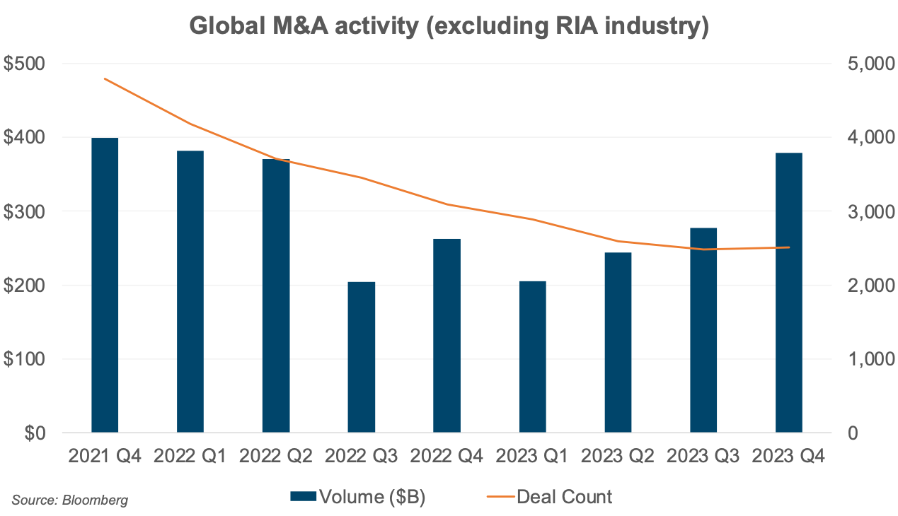 Relative to the broader M&A market, RIA deal activity has been exceptionally robust. The overall M&A transaction value for all industries (excluding the RIA industry) decreased 9% year-over-year through the fourth quarter of 2023 (per Bloomberg).