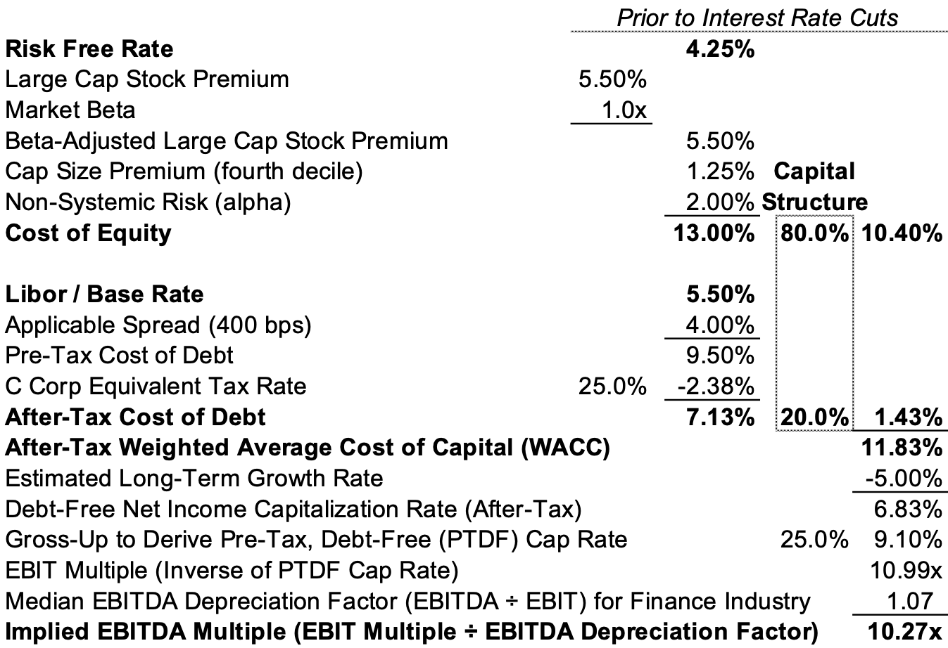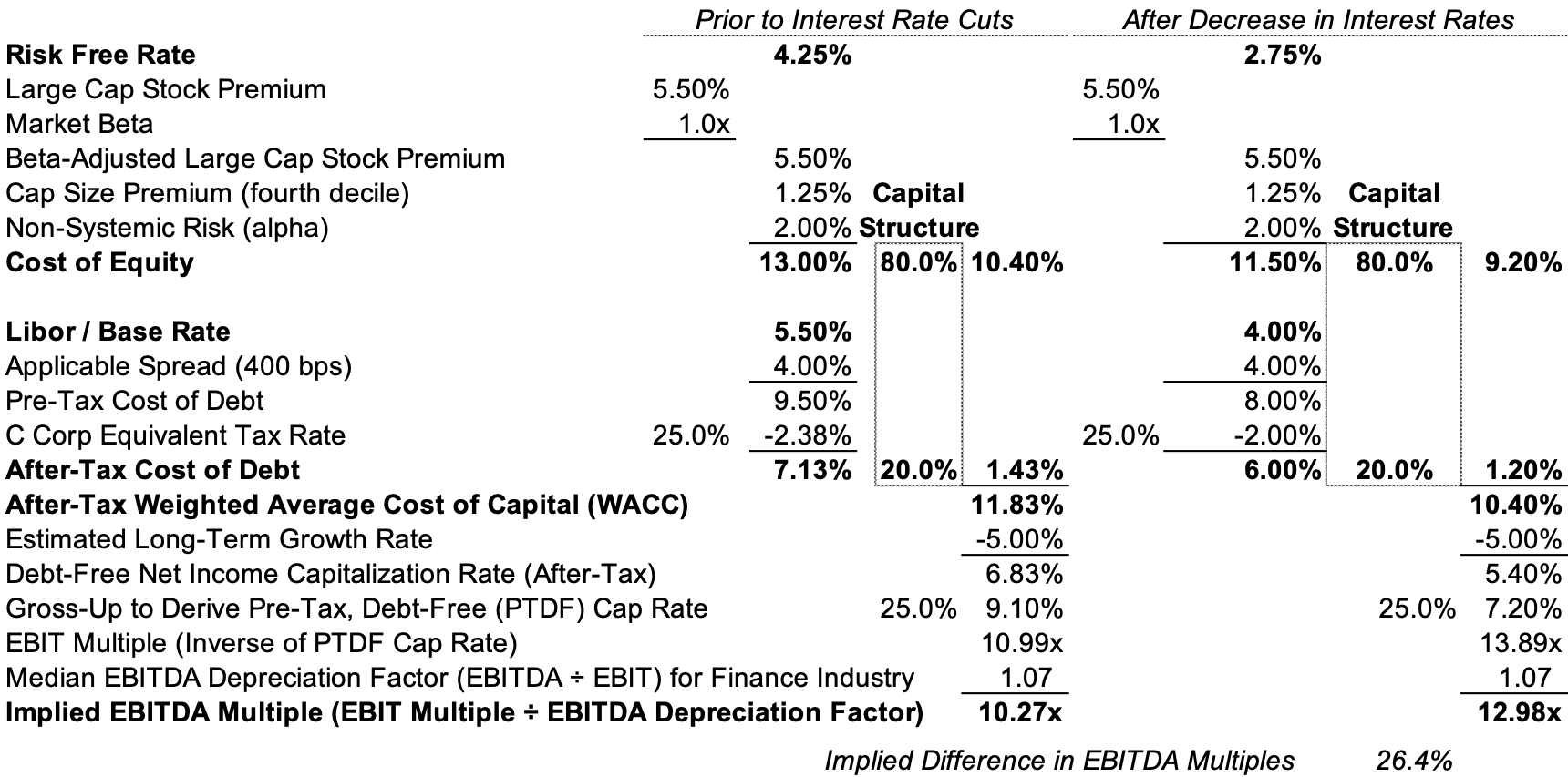 This illustration derives an implied EBITDA multiple prior to expected interest rate cuts. As noted below, a 1.5% decrease in the 10-Year Treasury yield (which we’re using to approximate changes in the risk-free rate here) results in a 21% increase in the EBITDA multiple (holding everything else constant) even though we’ve assumed no interest-bearing debt in the capital structure. The reason is lower interest rates reduce an RIA’s cost of equity capital because investors in these businesses will require the same incremental return over riskless alternatives to induce investment, so a lower risk-free rate means a lower overall required return on RIA investments. Sellers can negotiate higher prices to satisfy a buyer’s lower required return, and the EBITDA multiple (assuming no changes in EBITDA) will increase with the transaction price.
