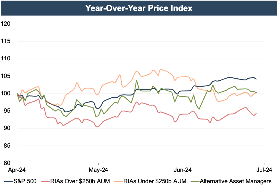 This momentum could certainly be derailed if inflationary expectations change and the market begins to anticipate further rate hikes, but that’s not the current consensus. RIA dealmaking has also held up reasonably well against the backdrop of higher interest rates over the last couple of years, so a significant decline in transaction multiples seems unlikely even if the Fed delays expected rate cuts. A more likely expectation is stable to modest improvements in RIA multiples if the Fed begins lowering interest rates later this year. We’ll monitor these trends and report back in next quarter’s M&A update.