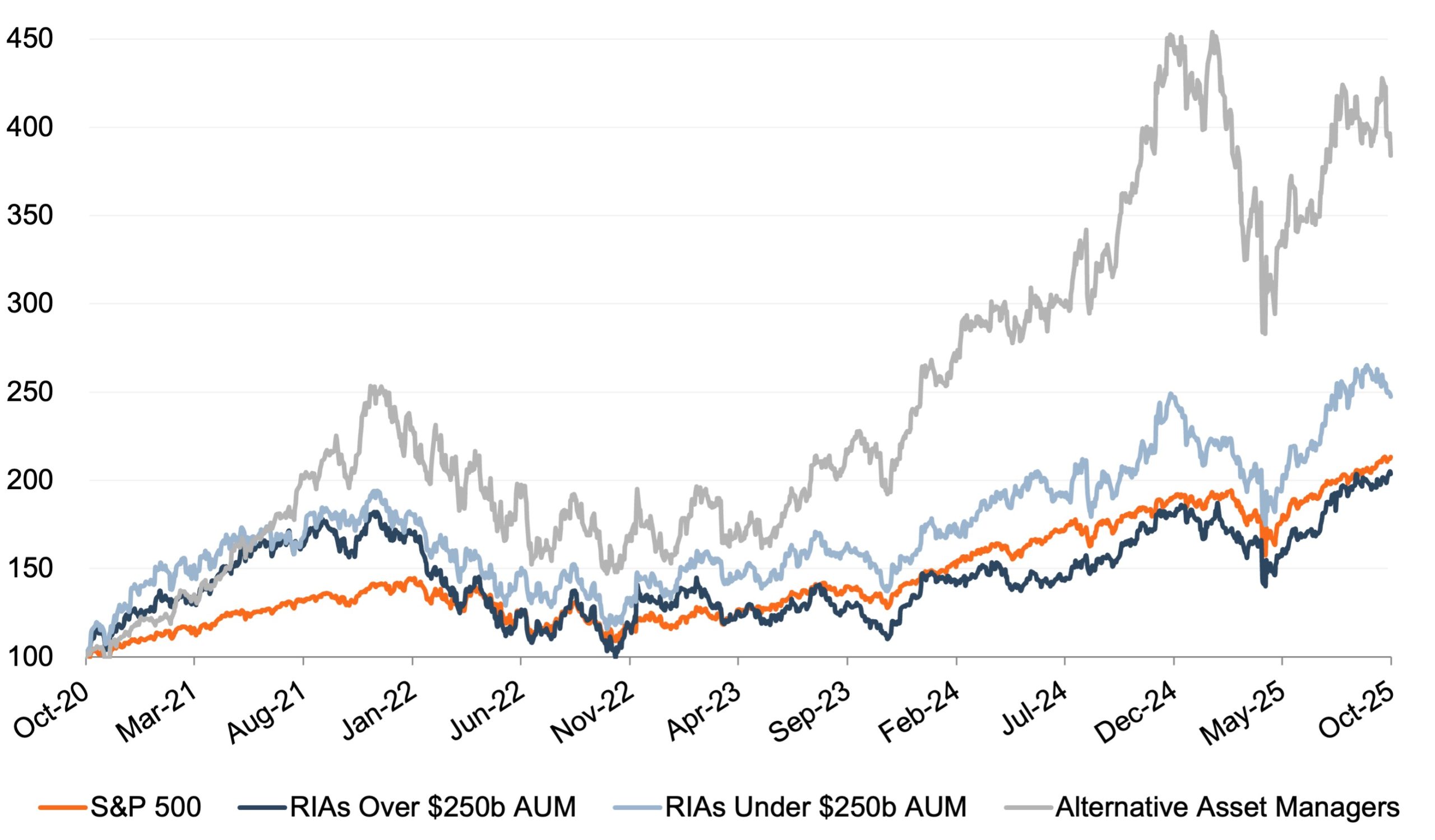 Though the Federal Reserve began easing policy in late 2024, higher-for-longer real yields and tighter liquidity conditions have weighed on private market fundraising and exits. Investors have shown renewed preference for liquidity and yield, benefiting traditional asset managers that offer liquid exposure to strong public equity markets. In contrast, alternative managers’ long-dated investment cycles and unrealized balance sheet positions have made them less attractive in a market environment emphasizing immediacy and visibility of returns, particularly as liquid alternatives products become increasingly accessible.