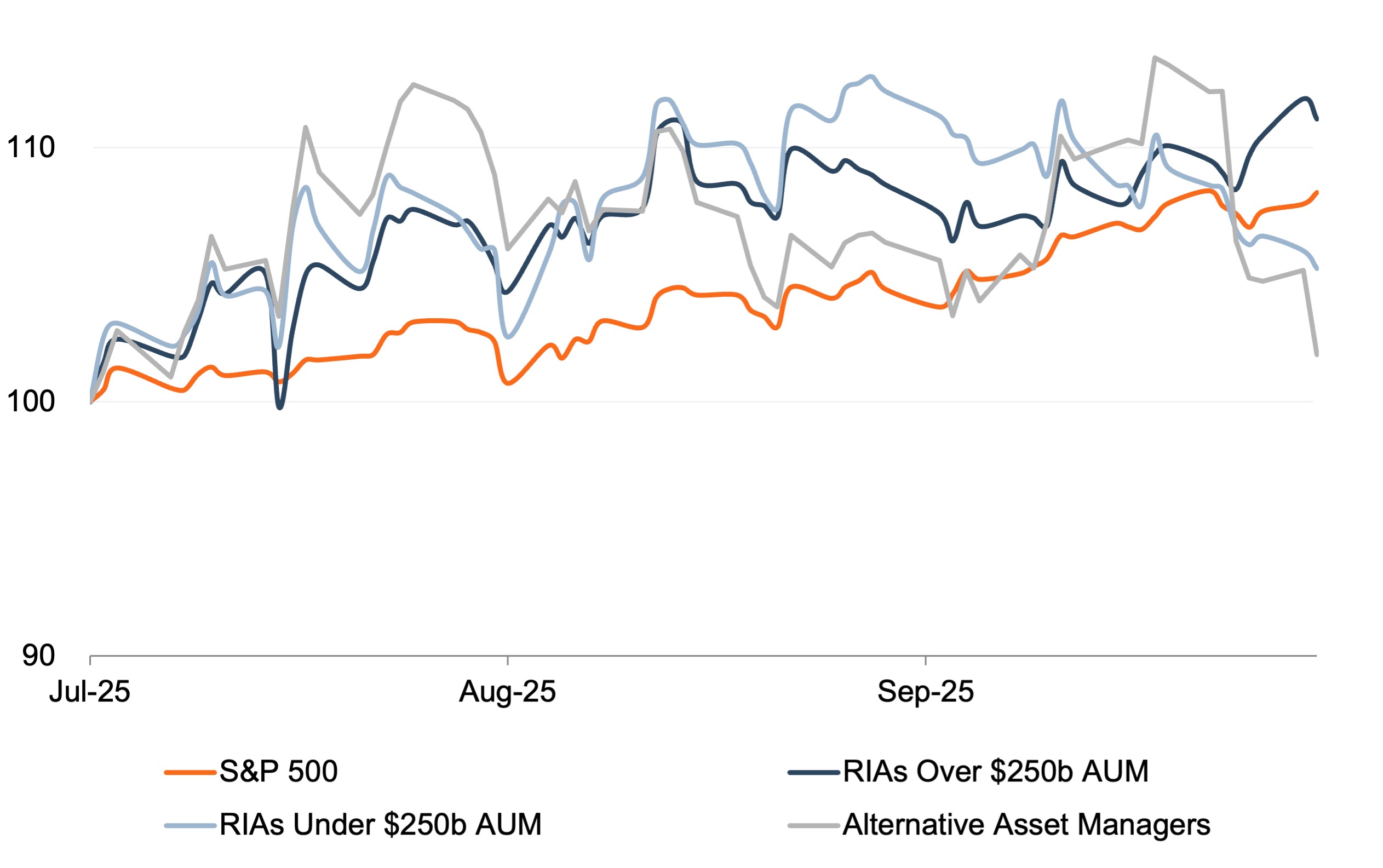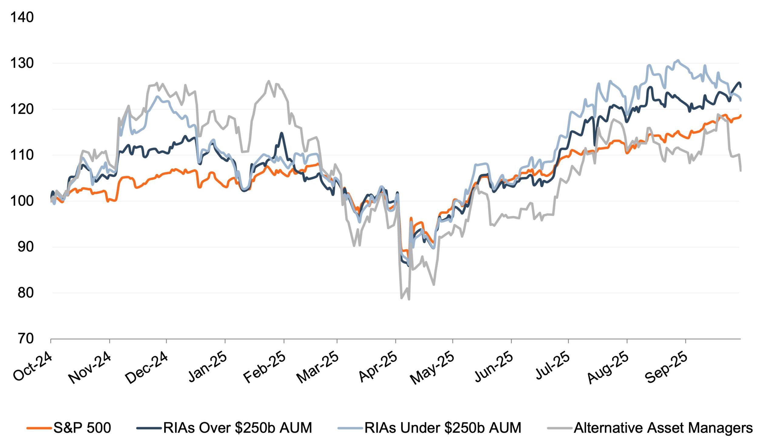 Following years of outperformance relative to other segments of publicly traded RIAs, alternative asset managers have begun to falter. Over the twelve months ending September 30, 2025, price returns of traditional asset and wealth managers exceeded that of the S&P 500, while alternative asset managers underperformed. Alternative asset managers posted 6.7% price gains for the year compared to 18.7% for the S&P 500. These trends come in spite of alternatives outperforming in fundamentals such as revenue and EBITDA growth.