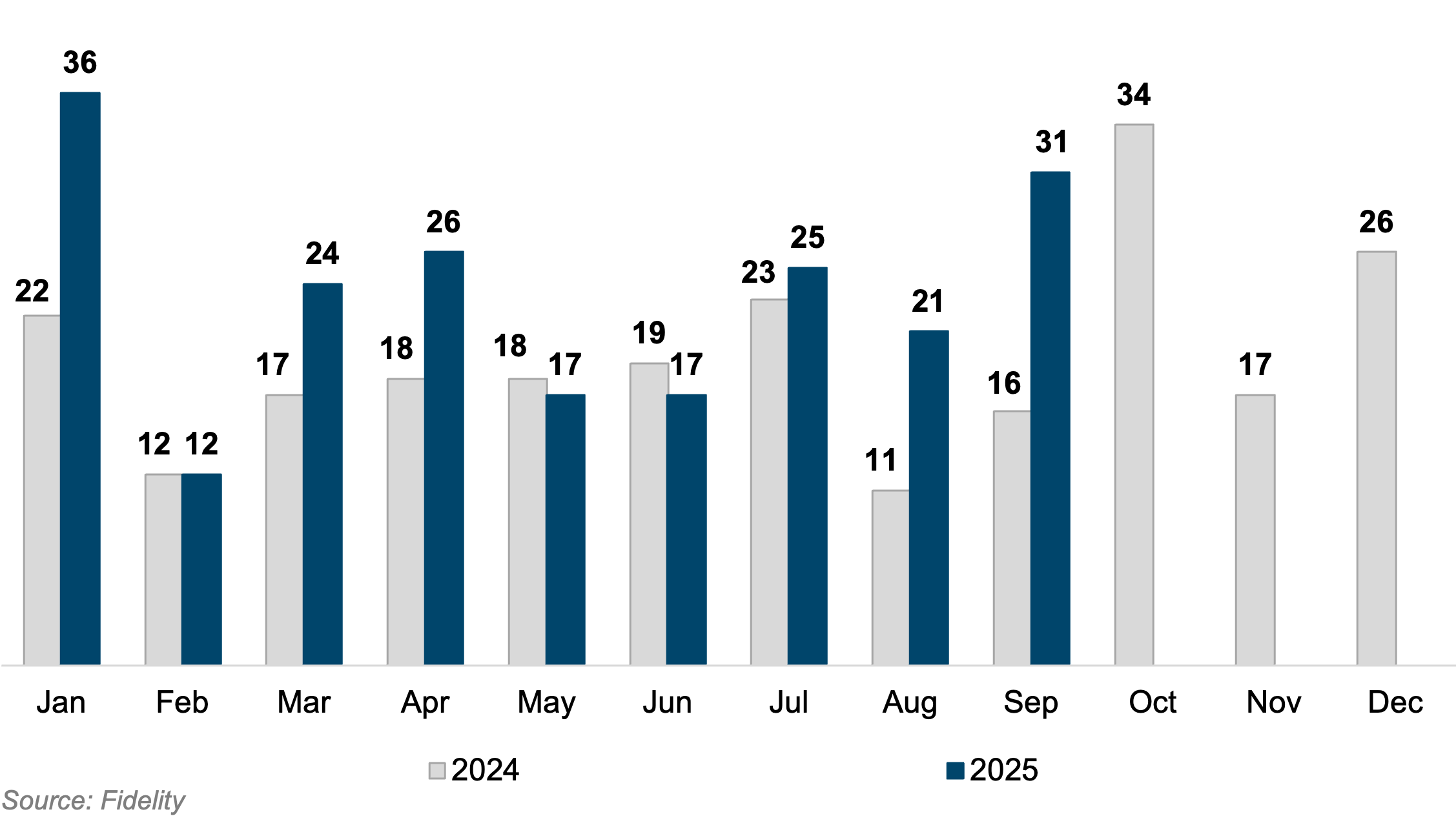M&A activity in the RIA industry, which had been trailing 2023 levels for much of 2024, experienced a surge in the first half of 2025. A spike in January set a new record for monthly deal volume, exceeding the high watermark previously set in October of 2024. Q1 2025 set a record for the number of transactions, which has since been superseded by Q3 2025 (72 vs 77 deals). Fidelity’s September 2025 Wealth Management M&A Transaction Report listed 209 deals through September, which exceeds the 156 deals executed during the same period in 2024.