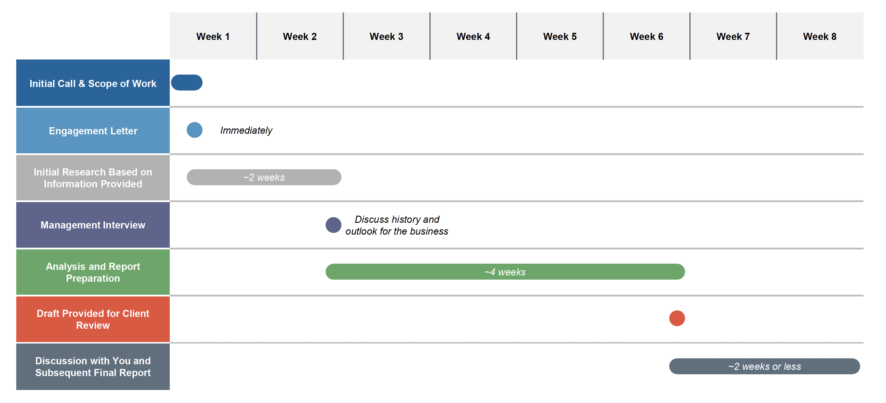 Every valuation process is a bit different, but they generally follow this outline. It typically takes six to eight weeks from start to finish, but this timeline can be tailored to fit your needs (within reason).