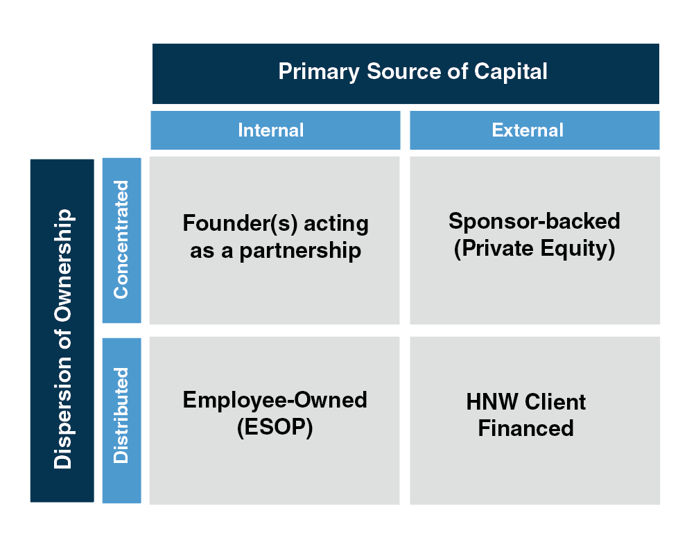RIAs are typically owned one of four ways, depending on whether their ownership is internal or external and whether or not the dispersion of ownership is broadly distributed or more concentrated.