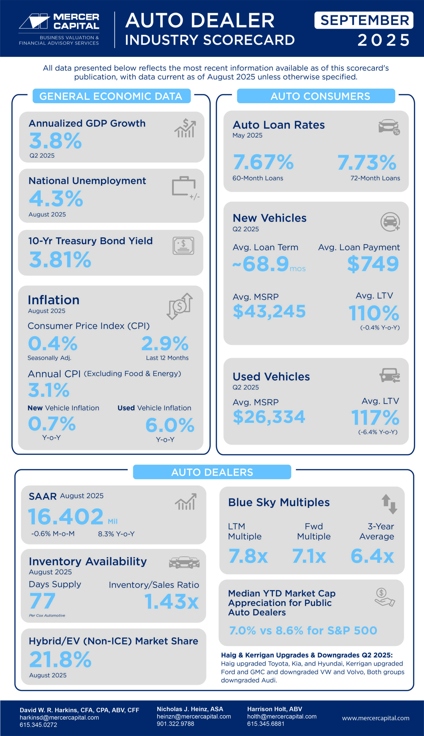 Our Auto Dealer Industry Scorecard gives readers insight into the industry’s latest data including general economic data and data specifically for auto consumers and auto dealers.