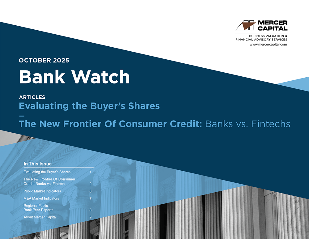 Brought to you by the Financial Institutions Team of Mercer Capital, these monthly newsletters are focused on bank activity in five U.S. regions. Each edition of Bank Watch highlights various banking metrics, including public market indicators, M&A market indicators, and key indices of the top financial institutions in your region, providing insight into financial institution valuation issues.