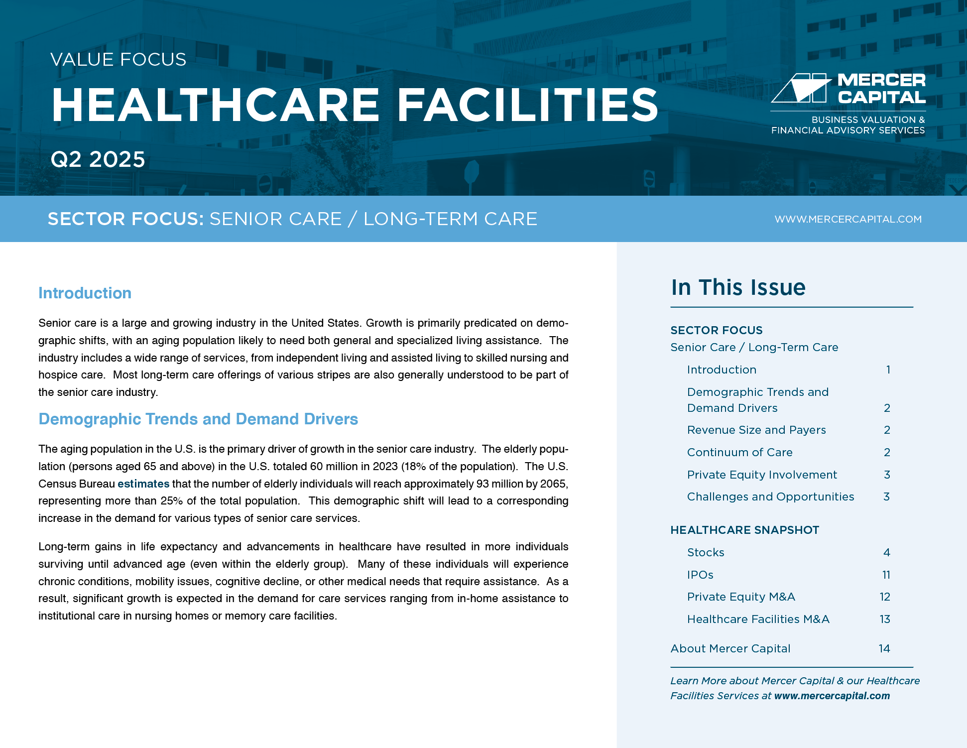 Mercer Capital provides a broad range of specialized valuation advisory services to the healthcare facilities industry, helping clients by providing independent valuation opinions and transaction advisory assistance. Our services for companies in the healthcare facilities industry include purchase price allocation, impairment testing, equity compensation, tax compliance, litigation support, corporate valuation services, and transaction advisory services.