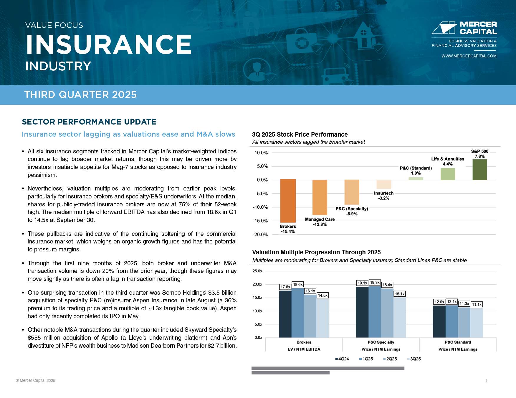Mercer Capital’s Value Focus: Insurance Industry reviews recent stock market performance by sector, analyzes the latest M&A trends, and provides a recap of industry pricing/valuation metrics. We cover brokers, insurtech, property & casualty, and life & health.