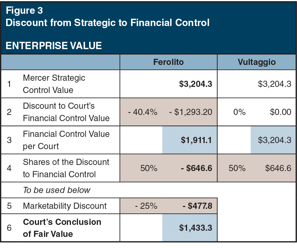 Line 1. Ferolito and Vultaggio each share, while they are 50%-50% owners, this potential value (or option), or $1.602 billion each in value. We calculated the discount in potential value from the strategic level down to Court's financial control to be $1.293 billion (i.e., from $3.204 billion down to $1.911 billion) in Figure 3.