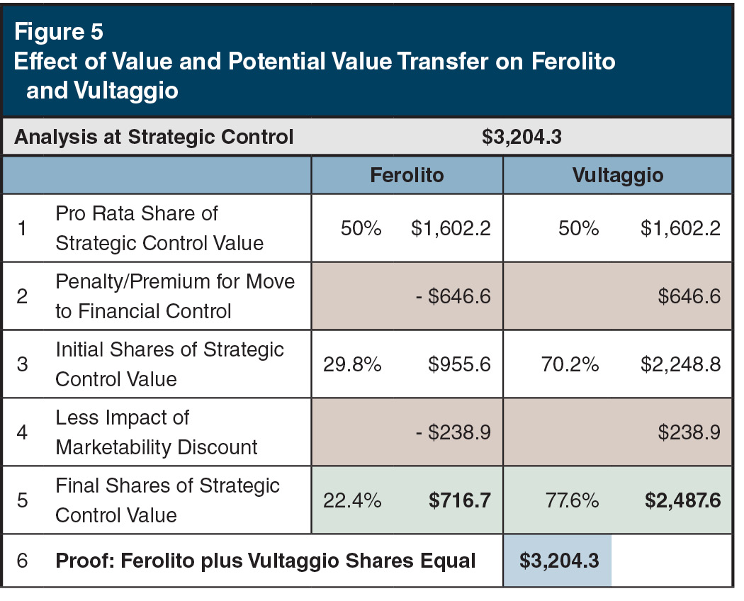 In Figure 5, we see that there is countervailing logic against the marketability discount, because given that the Court in the AriZona matter selected the financial control level of value rather than the strategic level, potential value is definitely transferred to Vultaggio in this case and controlling owners in general when marketability discounts are applied.