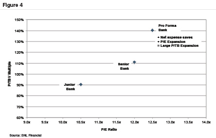 Whether selling or merging, we note for the surviving entity a key goal should be something akin to Figure 4 in which there is shared upside for both the acquirer’s and seller’s shareholders (assuming a merger structured as a share exchange). A well-structured and well-executed transaction can improve the pro forma bank’s profitability and growth prospects. If so, all shareholders may benefit not only from EPS accretion, but also multiple expansion.