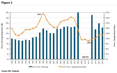 Today the majority of M&A activity involves sellers with $100 million to $1 billion of assets. According to the FDIC non-current loans and ORE for this group declined to 1.20% of assets as of September 30 from 1.58% in 2014. The most active subset of publicly traded banks that constitute acquirers is “small cap” banks. The SNL Small Cap U.S. Bank Index rose 9.2% during 2015 and finished the year trading for 17x trailing 12 month earnings. By way of comparison, SNL’s Large Cap U.S. Bank Index declined 1.3% and traded for 12x earnings. Strong acquisition currencies and few(er) problem assets of would-be sellers are a potent combination for deal making.