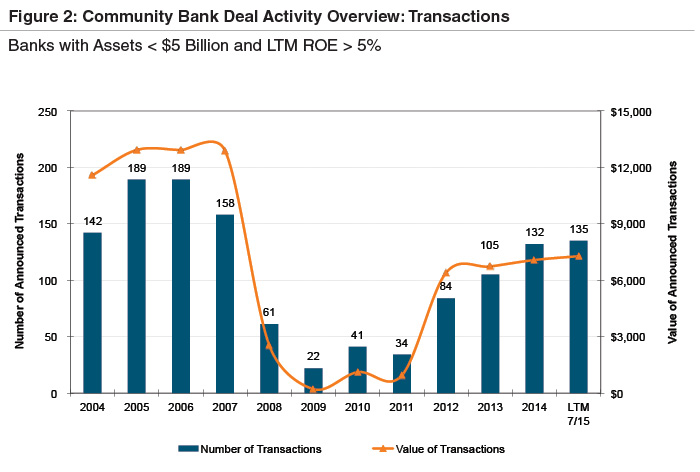 Despite much commentary about the significant economic and regulatory headwinds impacting community banks, profitability is on the mend. Community bank earnings improved in the trailing twelve months ended June 30, 2015 with net income up 14% to $17.6 billion compared to $15.5 billion in the twelve months ended June 30, 2014.1 Nearly 60% of community banks reported higher profitability based upon annualized first half 2015 net income compared to 2014 levels. The number of unprofitable banks also declined to 41 in the second quarter of 2015, compared to 109 in 2014 and 167 in 2013. The median return on assets (ROA) for community banks was up to 0.96% (annualized based upon the first half of 2015), which was the highest level since 2008.