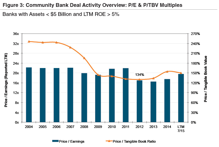 Another sign of improving community bank health is that deal activity is up from recent prior periods as shown in Figure 2. Price/earnings multiples have also improved in recent periods (Figure 3) and appear to be relatively in line with long-term trends at approximately 20x. Price/tangible book multiples are still below longer-term trends, largely reflecting that although improved from the Great Recession returns on assets and equity remain below pre-financial crisis levels.