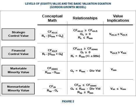 The integration of the basic income equation of value into the levels value chart results in the equations and relationships shown in Figure 2. It is here that we can begin to understand that valuation discounts and premiums are not devices in and of themselves. Each is the product (consequence) of the relationships among and between the underlying modeling elements that constitute financial valuation(cash flow, risk and growth). We note that the conceptual core of the mathematical relationships is generally centered on the freely traded world of the public stock markets, which is characterized as the “marketable minority” level of value (enjoying readily achievable liquidity in a regulated, timely, and efficient market). Although other levels of value can be directly observed in various markets, the marketable minority interest level of value characterizes the empirical world from which most valuation data and observations are made (i.e., Ibbotson).