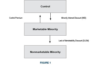 Regarding the concept of control premiums and minority interest discounts (also known as “lack of control discounts”), there is less conflict and more uniformity on how and when these discounts are used in a business appraisal. That is not to say that differences among appraisers don’t exist regarding certain issues. For purposes of establishing a platform to converse on valuation discounts and premiums, let us use the conventional levels of value framework to anchor the discussion. Figure 1 provides structure about where the traditional valuation discounts and premiums are applied in the continuum of value.
