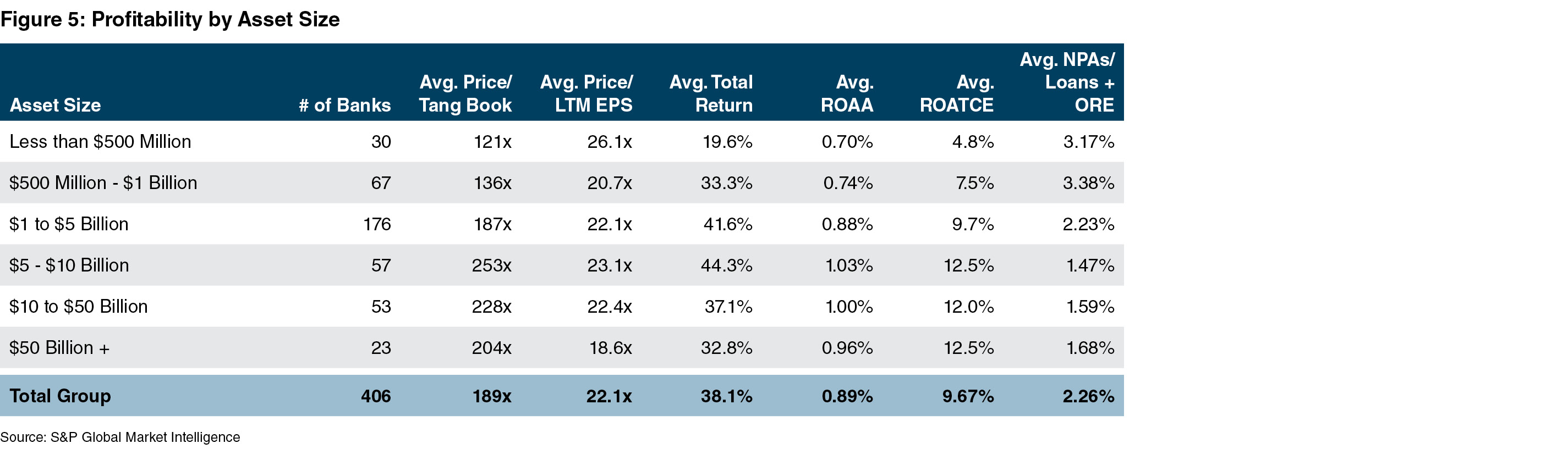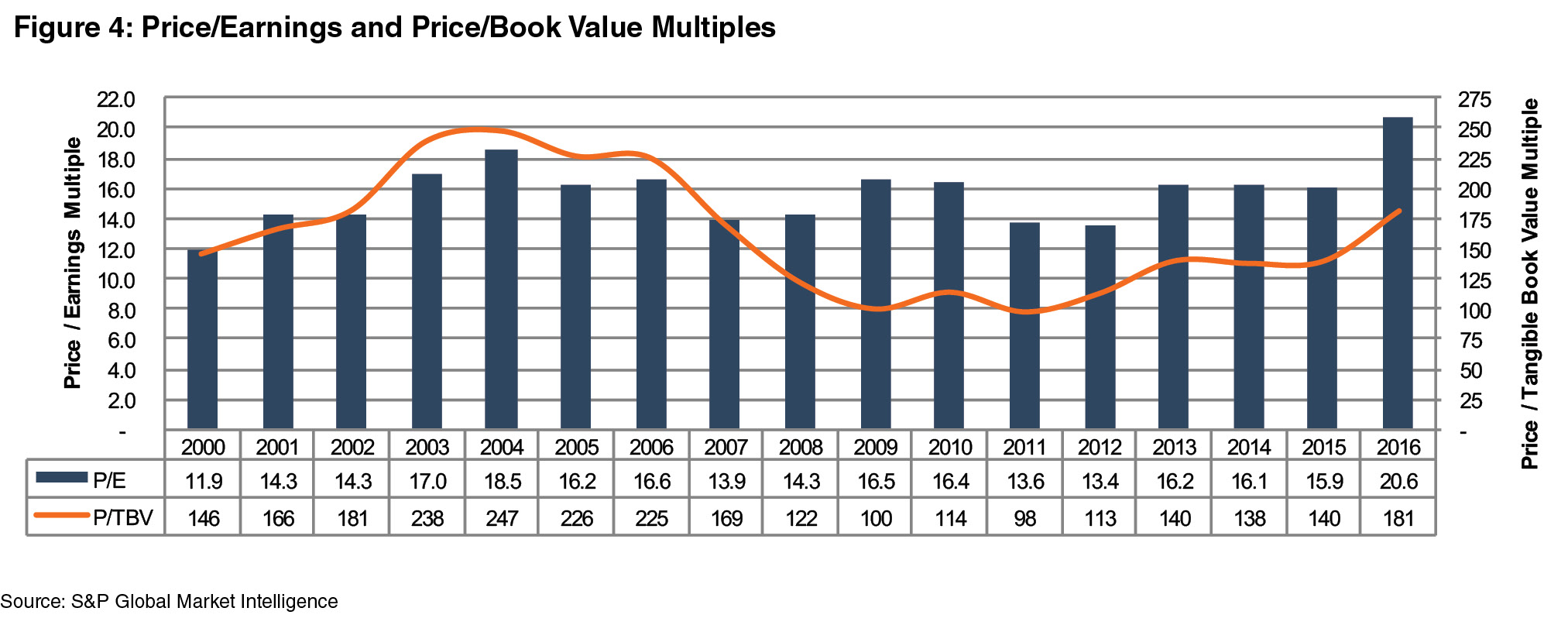 As shown in Figure 4, the median P/E for publicly-traded banks expanded about 30% to 20.6x trailing 12-month earnings at year-end from 15.9x at year-end 2015. Likewise, the median P/TBV multiple expanded to 181% from 140%. While bank stocks closed the year at the highest P/E level seen this century, P/TBV multiples remain below the pre-crisis peak given lower ROEs (ROTCEs), which in turn are attributable to higher capital and lower NIMs.