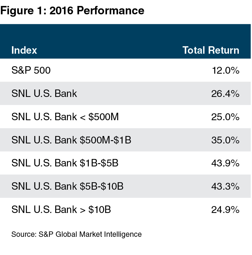 Not surprisingly, the heavily regulated financial sector outperformed the broader market, with bank stocks (as represented by the SNL U.S. Bank Index) gaining 23% versus 5% for the S&P from November 8th through the end of the year. Most of the return for the bank index was realized after the election given the full year total return of 26%. Banks in the $1 to $5 billion and $5 to $10 billion groups led the way in 2016 with total returns on the order of 44% for the year.