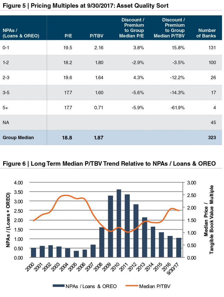To examine how profitability affects the value of your bank, we compare median P/TBV multiples for four groups of banks segmented by return on average tangible equity (Figures 3 and 4 on the prior page). A bank’s return on equity can be measured as the product of the asset base’s profitability (or return on assets) and balance sheet leverage. Balancing these two inputs in order to maximize returns to shareholders is one goal of bank management. A bank’s return on equity measures how productively the bank invests its capital, and as one would expect, the banks with the highest returns on equity trade at the highest P/TBV multiple.