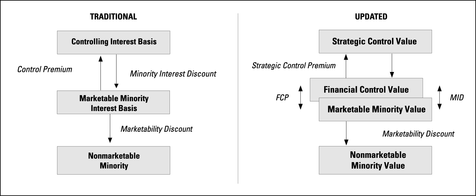 The traditional, three-level chart is shown on the left. The chart that is generally recognized by most writers in the field now is the four-level chart on the right. The levels at (or) above that of the marketable minority level are referred to as enterprise or entity levels of value. Values at the enterprise levels are developed based on the expected cash flows, risks and expected growth of the enterprises, or as noted above, "the value of the company as a whole and as a going concern."