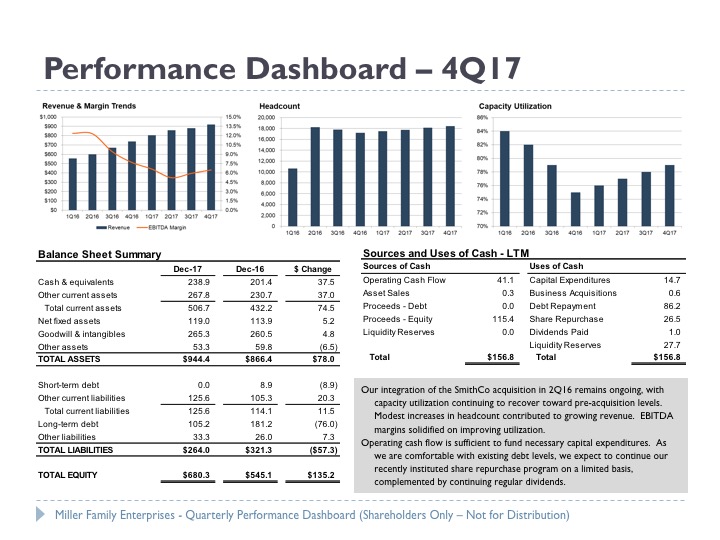 - Level of detail. Public company reports are quite detailed. Family business leaders should assess what level of detail is appropriate for shareholder communications. If the goal is to communicate, the appropriate level of detail should be defined with reference to that which is necessary to tell the company’s story. The detail needs to be presented to shareholders with sufficient supporting context regarding the company’s historical performance and conditions in the relevant industries and economy. A dashboard approach that focuses on key metrics, as illustrated below, can be an effective tool for focusing attention on the measures that matter.