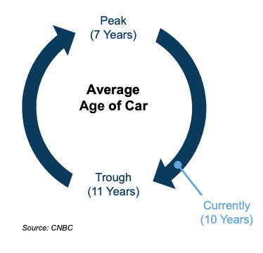 Another indicator of economic performance is an analysis of the auto cycle and where we are in that cycle based upon the average age of cars owned. The figure below illustrates the peak and trough of the auto cycle and where we sit today.