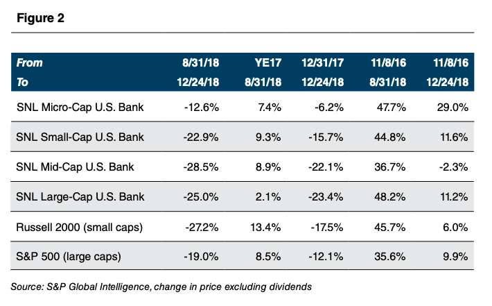 As 2018 draws to a close, bank fundamentals are very good; however, bank stock prices have tanked. SNL Financial’s small-, mid-, and large-cap bank indices have fallen by more than 20% since August 31, which meets the threshold definition of a bear market (i.e., down 20% vs. 10% for a correction).