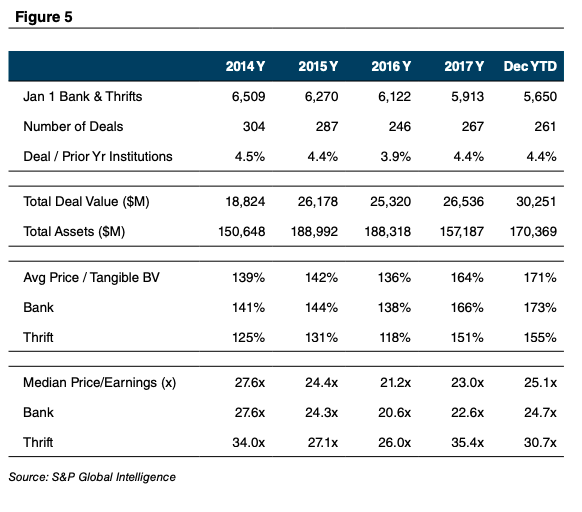 The total number of bank and thrift transactions through December 24 totaled 261, which equated to 4.4% of the commercial bank and thrift charters as of year-end 2017. During 2014–2018, the number of acquisitions exceeded 4% each year except for 2016 when activity at the beginning of the year was hampered by weak stock prices as a result of a slowing economy that was marked by a collapse in oil prices and sharply wider credit spreads.