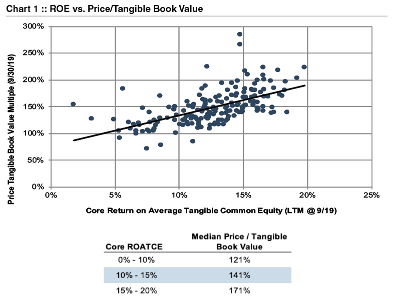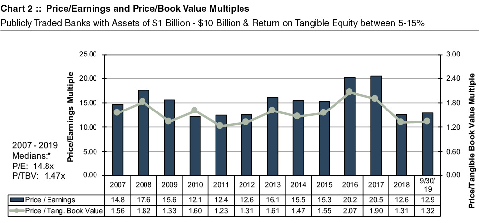 Since banking is a more mature industry, bank price/earnings multiples tend to vary within a relatively tight range. Chart 2 provides some perspective on historical price/earnings and price/tangible book value multiples, which includes banks traded on the NASDAQ, NYSE, or NYSEAM with assets between $1 and $10 billion and a return on core tangible common equity between 5% and 15%. Trading multiples in the first several years of the analysis may be distorted by recessionary conditions, while the multiples reported for 2016 and 2017 were exaggerated by optimism regarding the potential, at that time, for tax and regulatory reform. The diminished multiples at yearend 2018 and September 30, 2019 reflect a challenging interest rate environment, marked by a flat to inverted yield curve, and the possibility for rising credit losses in a cooling economy.