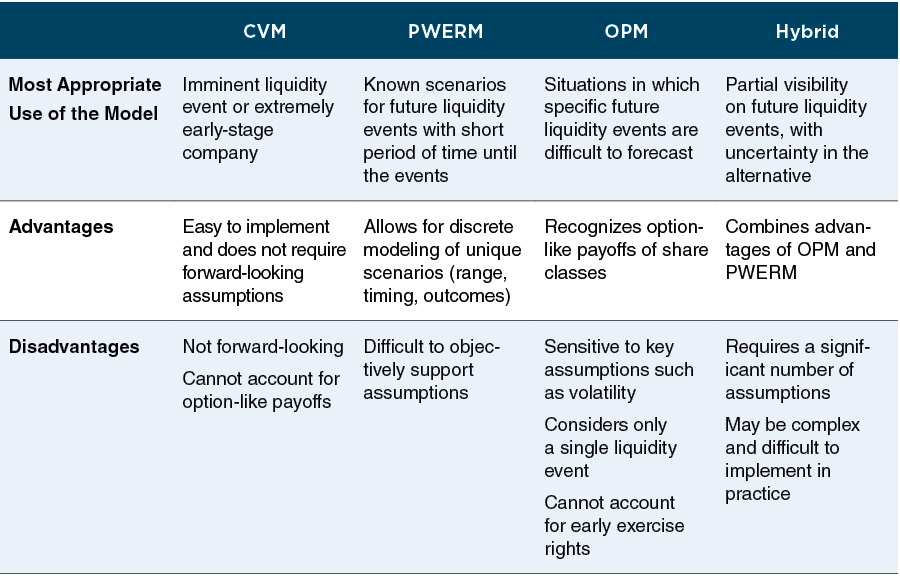 - Complexity and Stage of Development. The complexity of the method selected should be appropriate to the company’s stage of development. In other words, a simpler valuation method (like an OPM) with fewer underlying assumptions may be more appropriate for an early-stage entity with few employees than a highly complex method (like a PWERM).