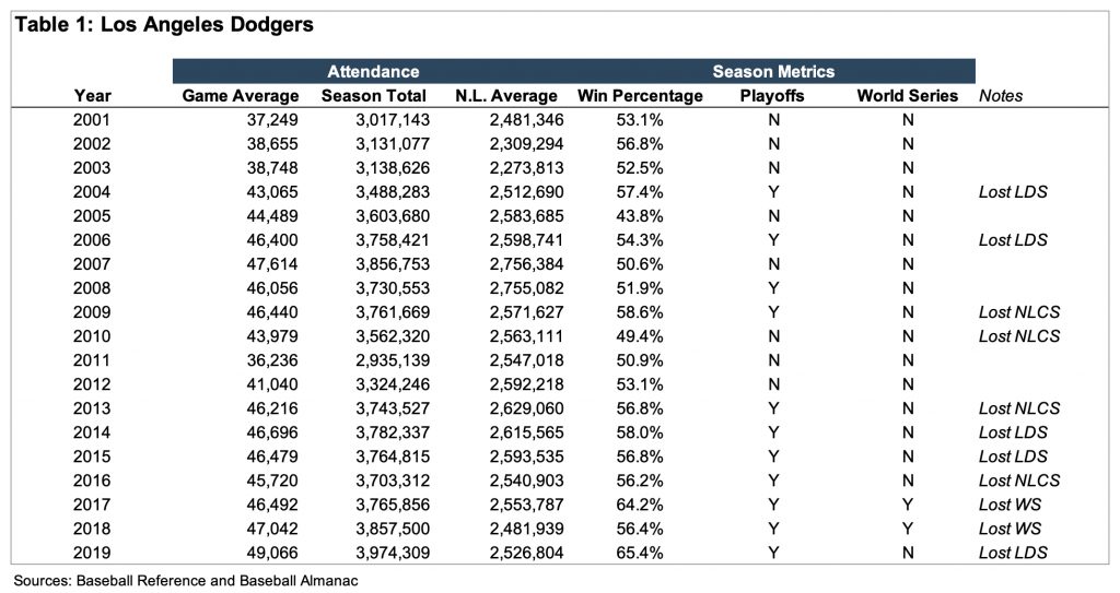 This growth was greatly influenced by the Dodgers being in the World Series in 2017 and 2018, which helped push 2019 to a record high attendance. (See Table 1 for details)