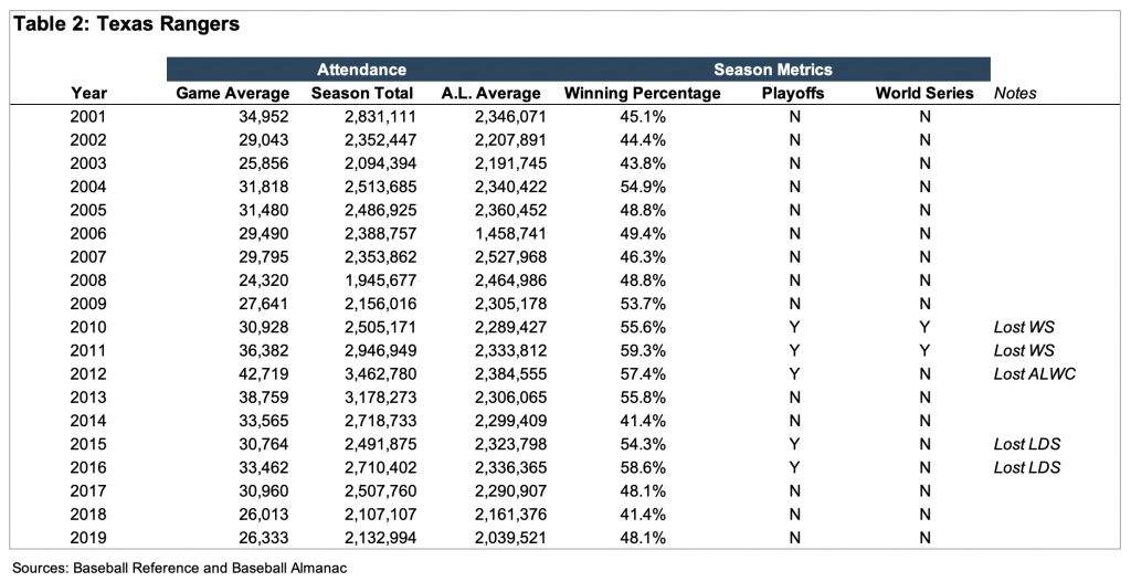 Attendance followed the same trend by dropping 450,000 to 2.7 million in 2014. Even when the team made the playoffs in 2015, attendance fell to 2.5 million as a result of their poor record in 2014. The team’s 2015 win/loss ratio was near 59% and they made the playoffs, but not the World Series. In the following year, attendance increased to 2.7 million. The win/loss ratio dropped below 50% in 2017 to 2019 and they missed the playoffs each year. As a result, attendance dropped steadily to 2.1 million in 2019, a decrease of over 1.3 million people, or 38% from their peak in 2012. (SeeTable 2 for details)